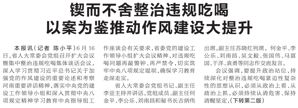6月16日,省人大常委会党组召开扩大会议暨集中整治违规吃喝集体谈话会议,深入学习贯彻习近平总书记关于加强党的作风建设的重要论述和考察河南重要讲话精神,落实中央党的建设工作领导小组和深入贯彻中央八项规定精神学习教育中央指导组工作座谈会有关要求,省委党的建设工作领导小组扩大会议精神,对违规吃喝问题再敲警钟、再严禁令,切实筑牢中央八项规定堤坝,确保学习教育走深走实。(今日《河南日报》1版、2版)