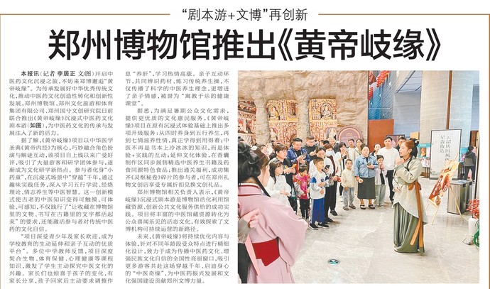开启中医药文化沉浸之旅,不妨来郑博邂逅“黄帝岐缘”。为传承发展好中华优秀传统文化,推动中医药文化创造性转化和创新性发展,郑州博物馆、郑州文化旅游和体育集团有限公司、郑州国兮文创研究院日前联合推出《黄帝岐缘》沉浸式中医药文化剧本游,为中医药文化的传承与发展注入了新的活力。(今日《郑州日报》8版)
