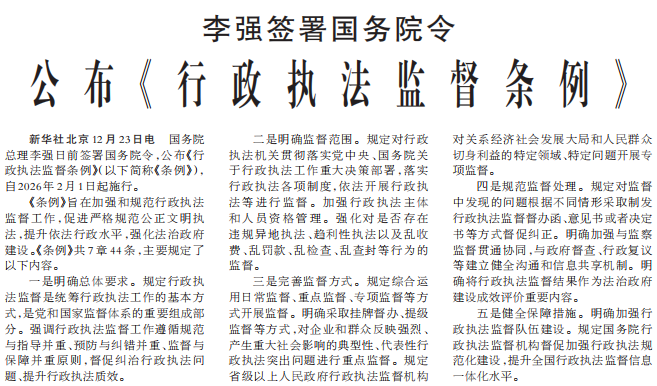 国务院总理李强日前签署国务院令,公布《行政执法监督条例》,自2026年2月1日起施行。(今日《人民日报》1版)