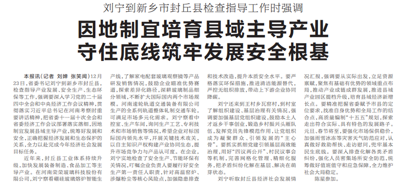 12月23日,省委书记刘宁到新乡市封丘县,检查指导产业发展、安全生产、生态环保等工作,强调要深入学习党的二十届四中全会和中央经济工作会议精神,贯彻落实习近平总书记在河南考察时重要讲话精神,把省委十一届十次全会和省委经济工作会议部署落实落细,因地制宜发展县域主导产业,统筹好发展和安全,正确把握经济发展和生态保护的关系,全力以赴完成今年经济社会发展目标任务。(今日《河南日报》1版)