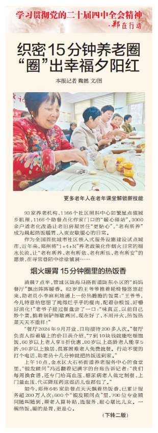 93家养老机构、1166个社区照料中心如繁星点缀城乡肌理,1166个助餐点化作家门口的“暖心驿站”,3000余户适老化改造让老旧房屋居住“更贴心”,“老有所养”成为晨起热饭暖胃、入夜安歇暖心的日常。(今日《郑州日报》1版、2版)