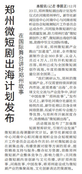 12月23日,郑州微短剧出海计划发布仪式在河南郑州举行。新华社新闻信息中心河南中心与河南省视听业协会短视频短片工作委员会达成合作,共同服务微短剧行业高质量发展,助力郑州打造“微短剧创作之都”、微短剧出海创作基地,助推中华文化国际传播。(今日《郑州日报》1版)