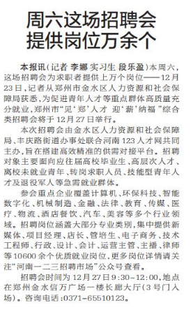 本周六,这场招聘会为求职者提供上万个岗位——12月23日,记者从郑州市金水区人力资源和社会保障局获悉,为促进青年人才等重点群体高质量充分就业,郑州市“见‘郑’人才 迎‘薪’纳福 ”综合类招聘会将于12月27日举行。(今日《郑州日报》2版)