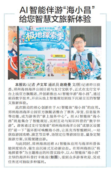 记者昨日获悉,郑州海昌海洋公园日前与支付宝联手,正式在支付宝平台上线官方旗舰店,并创新推出AI智能伴游“海小昌”,通过前沿数字技术,开启从线上智能规划到线下沉浸交互的智慧文旅新体验。(今日《郑州日报》2版)
