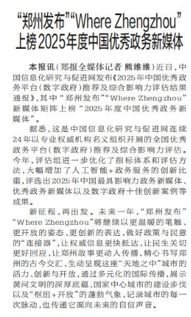 近日,中国信息化研究与促进网发布《2025年中国优秀政务平台(数字政府)推荐及综合影响力评估结果通报》,其中 “郑州发布”“Where Zhengzhou”新媒体矩阵上榜 “2025年度中国优秀政务新媒体”。(今日《郑州日报》2版)