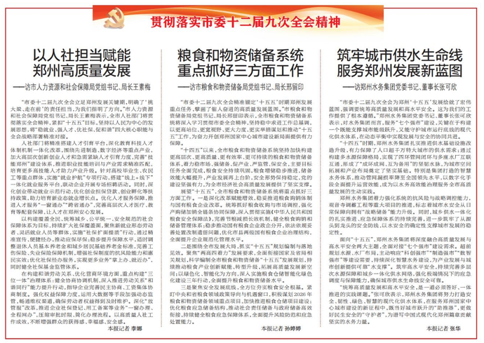 “市委十二届九次全会立足郑州发展关键期,明确了‘挑大梁、走在前’的责任担当,为我们指明了方向。”市人力资源和社会保障局党组书记、局长王素梅表示,全市人社部门将贯彻落实全会精神,紧扣“十五五”目标,坚持以人民为中心的发展思想,将“稳就业、强人才、优社保、促和谐”四大核心职能与全会战略部署精准对接。(今日《郑州日报》2版)