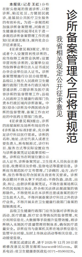 分布在街头巷尾的普通诊所、口腔诊所,贴近社区,方便居民就诊,是基层公共医疗卫生服务的有效补充。为进一步规范和加强诊所备案管理,河南省卫生健康委组织起草《关于进一步规范诊所备案管理工作的通知(征求意见稿)》,面向社会公开征求意见。(今日《郑州日报》2版)
