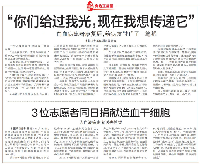 12月23日,河南3位志愿者分别在郑州、平顶山两地完成造血干细胞捐献,为3位陌生的血液病患者点燃重生希望。3位志愿者虽然来自不同城市、不同岗位,却因同样的爱心与勇气,在同一天完成了生命接力。至此,全省非血缘关系造血干细胞捐献累计达到1612例。(今日《郑州日报》5版)