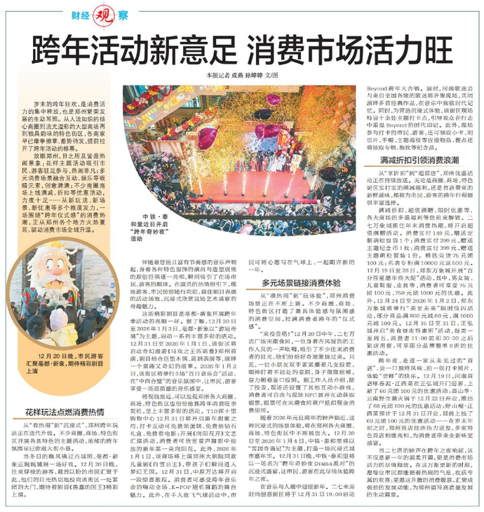 岁末的跨年狂欢,是消费活力的集中释放,也是郑州繁荣发展的生动写照。从人流如织的核心商圈到流光溢彩的大型商场再到独具韵味的特色街区,各商家早已摩拳擦掌、蓄势待发,提前拉开了跨年活动的帷幕。(今日《郑州日报》6版)