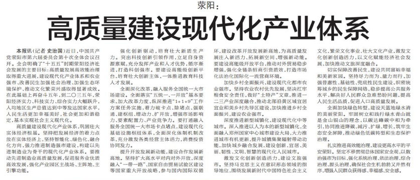 近日,中国共产党荥阳市第六届委员会第十次全体会议召开。全会明确了“十五五”时期荥阳经济社会发展的主要目标:高质量发展高效能治理取得重大进展,建设现代化产业体系和农业强市、改善民生加强社会治理、加强生态环境保护、推动文化繁荣兴盛取得显著成效。在此基础上再奋斗五年,到二〇三五年,荥阳经济实力、科技实力、综合实力大幅跃升,人均地区生产总值达到中等发达国家水平,人民生活更加幸福美好,社会更加和谐稳定,基本实现社会主义现代化。(今日《郑州日报》7版)