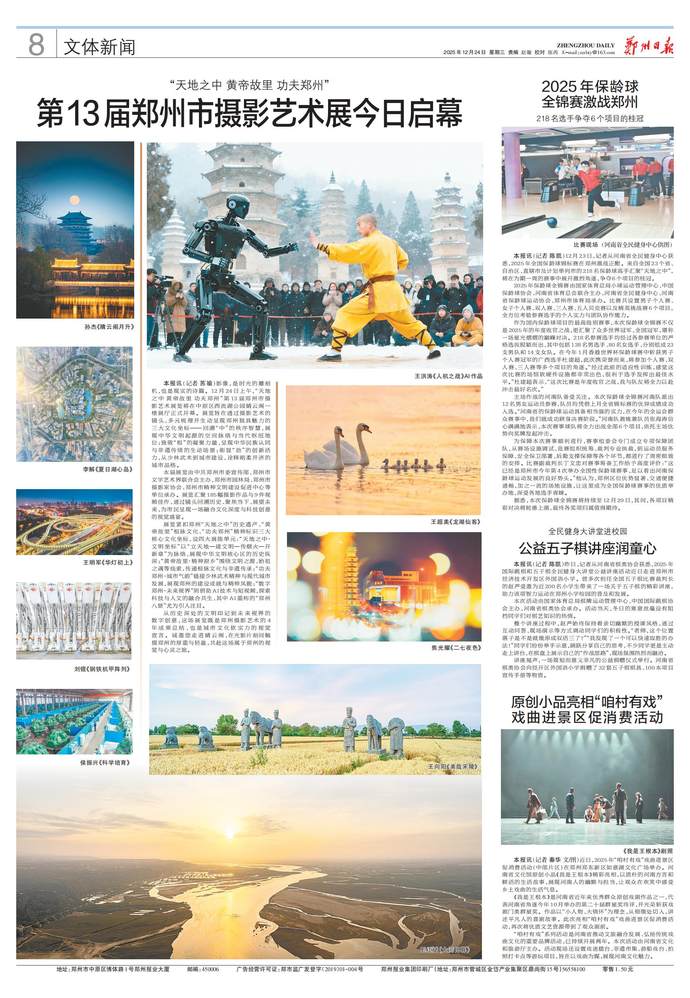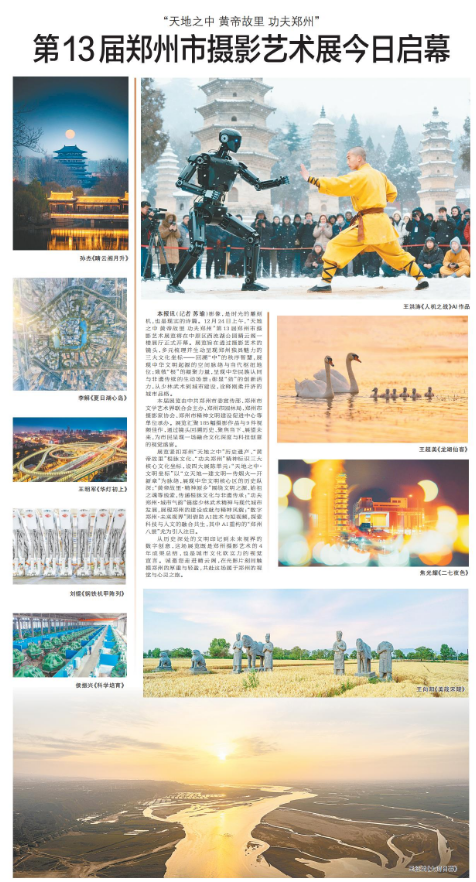 影像,是时光的雕刻机,也是现实的诗篇。12月24日上午,“天地之中 黄帝故里 功夫郑州”第13届郑州市摄影艺术展览将在中原区西流湖公园晴云阁一楼展厅正式开幕。展览旨在透过摄影艺术的镜头,多元梳理并生动呈现郑州独具魅力的三大文化坐标——回溯“中”的秩序智慧,展现中华文明起源的空间脉络与当代枢纽地位;致敬“根”的凝聚力量,呈现中华民族认同与非遗传续的生动场景;彰显“劲”的创新活力,从少林武术到城市建设,诠释刚柔并济的城市品格。(今日《郑州日报》8版)