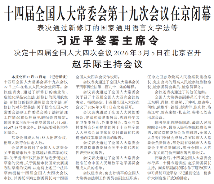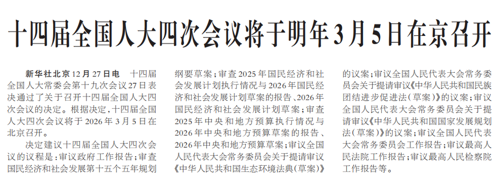 十四届全国人大常委会第十九次会议27日表决通过了关于召开十四届全国人大四次会议的决定。根据决定,十四届全国人大四次会议将于2026年3月5日在北京召开。(今日《人民日报》1版)