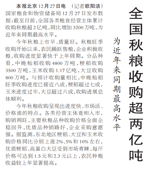 国家粮食和物资储备局12月27日发布数据:截至目前,全国各类粮食经营主体累计收购秋粮超2亿吨,同比增加3200万吨,为近年来同期最高水平。(今日《人民日报》1版)