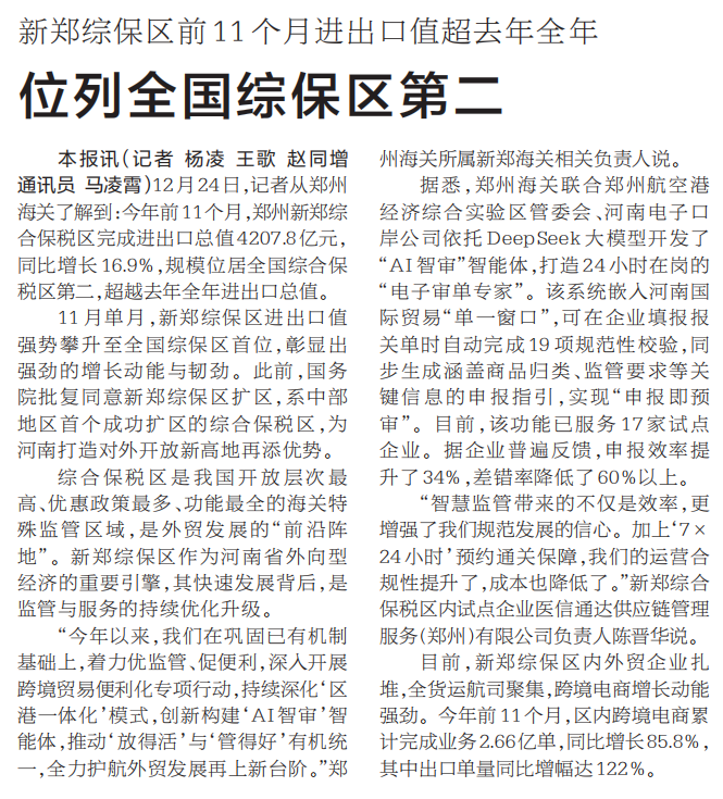 12月24日,记者从郑州海关了解到:今年前11个月,郑州新郑综合保税区完成进出口总值4207.8亿元,同比增长16.9%,规模位居全国综合保税区第二,超越去年全年进出口总值。(今日《河南日报》1版)