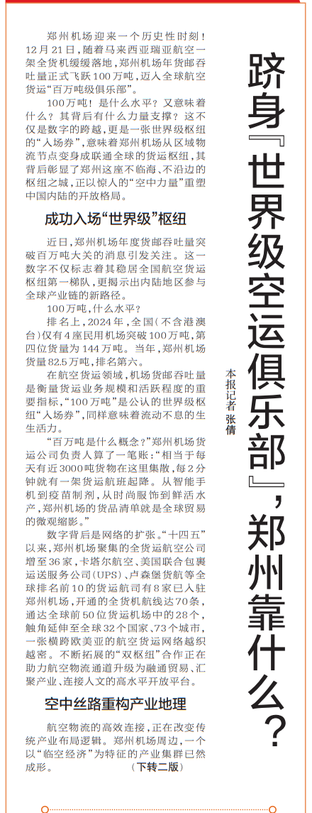 郑州机场迎来一个历史性时刻!12月21日,随着马来西亚瑞亚航空一架全货机缓缓落地,郑州机场年货邮吞吐量正式飞跃100万吨,迈入全球航空货运“百万吨级俱乐部”。(今日《郑州日报》1版、2版)