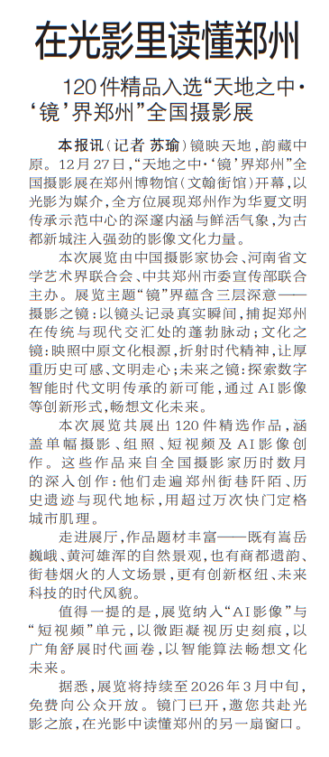 镜映天地,韵藏中原。12月27日,“天地之中·‘镜’界郑州”全国摄影展在郑州博物馆(文翰街馆)开幕,以光影为媒介,全方位展现郑州作为华夏文明传承示范中心的深邃内涵与鲜活气象,为古都新城注入强劲的影像文化力量。(今日《郑州日报》1版)