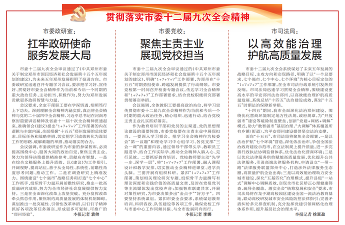 市委十二届九次全会审议通过的《中共郑州市委关于制定郑州市国民经济和社会发展第十五个五年规划的建议》,明确“1+7+7+7”工作部署,为郑州在“十五五”时期勇担使命、跨越发展提供了行动纲领。市委党校第一时间召开校委专题会议,传达学习全会精神和“1+7+7+7”工作部署要求,结合党校职能研究部署贯彻落实举措。