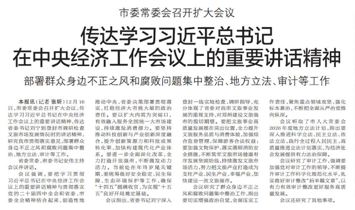 12月16日,市委常委会召开扩大会议,传达学习习近平总书记在中央经济工作会议上的重要讲话精神,传达省委书记刘宁到登封市调研检查文旅市场发展情况时的讲话精神,研究我市贯彻落实意见,部署群众身边不正之风和腐败问题集中整治、地方立法、审计等工作。