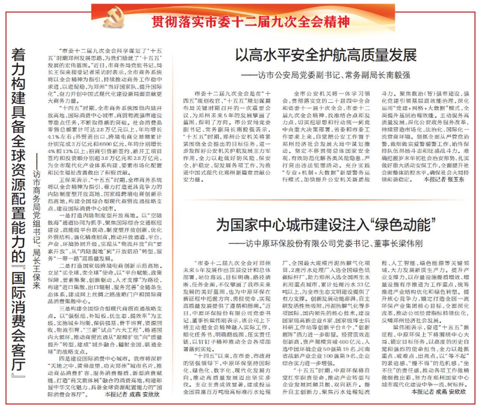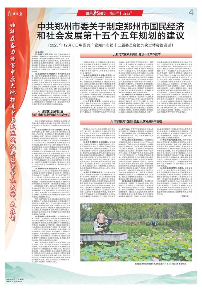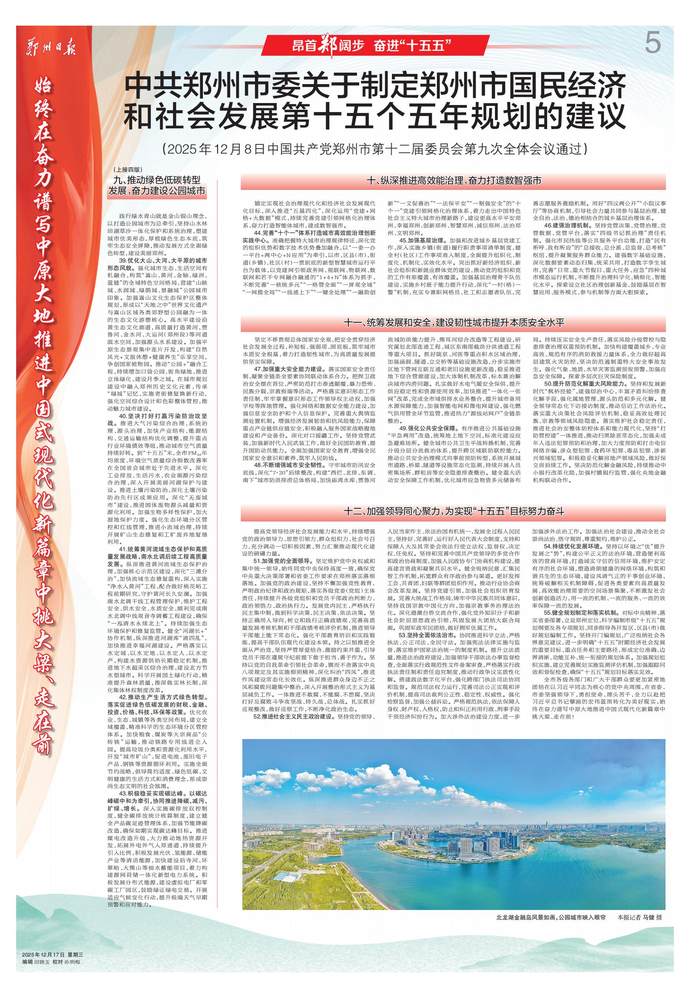 中国共产党郑州市第十二届委员会第九次全体会议深入贯彻党的二十届四中全会精神,全面落实省委十一届十次全会部署,认真分析国家中心城市建设阶段性特征,就制定郑州市国民经济和社会发展“十五五”规划提出以下建议。(今日《郑州日报》1版、2版、3版、4版、5版)