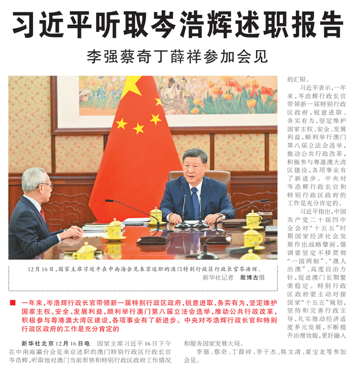 ■ 一年来,岑浩辉行政长官带领新一届特别行政区政府,锐意进取、务实有为,坚定维护国家主权、安全、发展利益,顺利举行澳门第八届立法会选举,推动公共行政改革,积极参与粤港澳大湾区建设,各项事业有了新进步。中央对岑浩辉行政长官和特别行政区政府的工作是充分肯定的