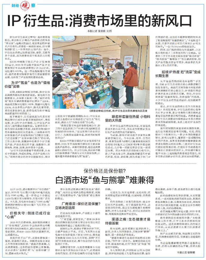 你为IP衍生品买过单吗?是在看完电影后,通过购买IP周边产品的形式把角色“带回家”;是购买饮品时,被菜单里的IP联名产品吸引;还是到一座新的城市,打卡博物馆时买上一份喜欢的文创产品?如今,IP衍生品消费已经渗透文娱、餐饮、文旅等多个场景,成为消费市场中极具活力的增长点。(今日《郑州日报》11版)