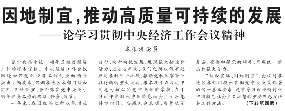 党中央集中统一领导是做好经济工作的根本保证。中央经济工作会议围绕加强党对经济工作的全面领导提出明确要求,强调各地区各部门结合实际、因地制宜,全面落实党中央关于明年经济工作的思路、任务、政策。(今日《人民日报》1版、4版)