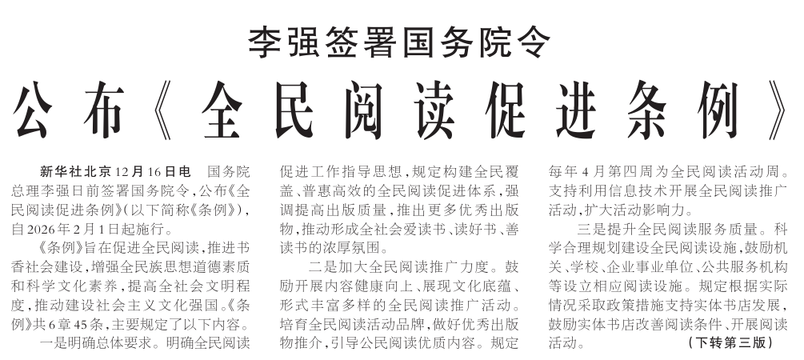 国务院总理李强日前签署国务院令,公布《全民阅读促进条例》(以下简称《条例》),自2026年2月1日起施行。(今日《人民日报》1版、3版)