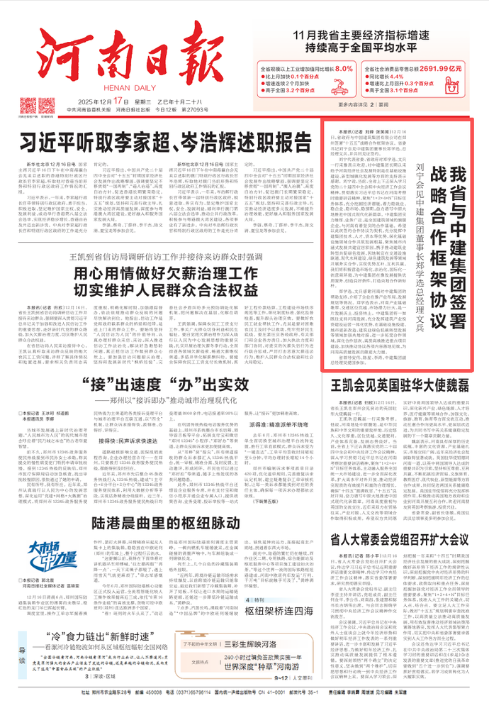 12月16日,省政府与中国建筑集团有限公司在郑州签署“十五五”战略合作框架协议。省委书记刘宁会见中建集团董事长郑学选、总经理文兵,并共同见证签约。(今日《河南日报》1版)