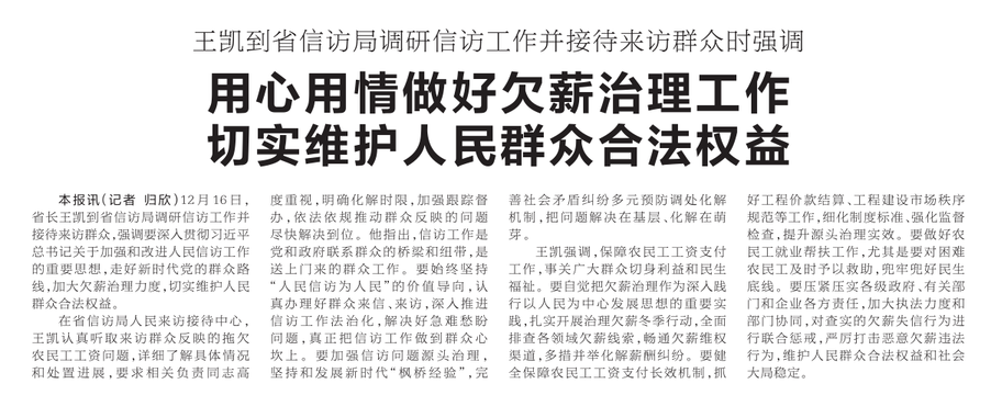 12月16日,省长王凯到省信访局调研信访工作并接待来访群众,强调要深入贯彻习近平总书记关于加强和改进人民信访工作的重要思想,走好新时代党的群众路线,加大欠薪治理力度,切实维护人民群众合法权益。(今日《河南日报》1版)