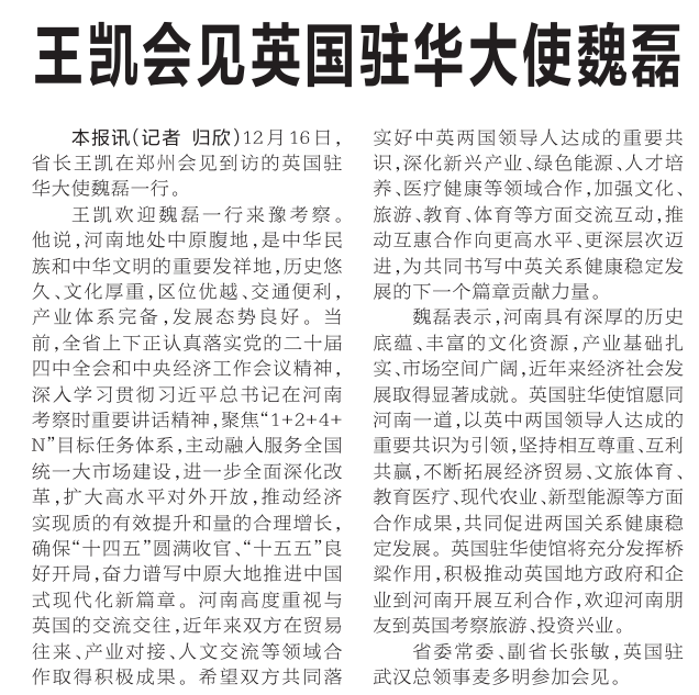 12月16日,省长王凯在郑州会见到访的英国驻华大使魏磊一行。(今日《河南日报》1版)