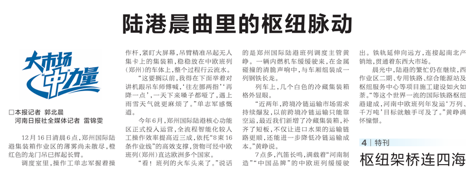 12月16日清晨6点,郑州国际陆港集装箱作业区的薄雾尚未散尽,橙红色的龙门吊已挥起长臂。(今日《河南日报》1版)