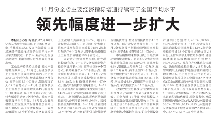12月16日,记者从省统计局获悉,11月份,全省工业、消费增速加快,投资平稳增长,主要经济指标增速持续高于全国平均水平且领先幅度进一步扩大,经济运行呈现平稳向好、趋新向优、韧性增强的良好态势。(今日《河南日报》2版)