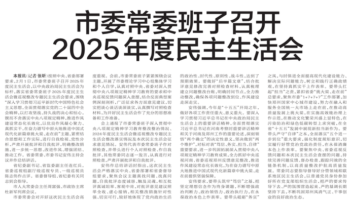 按照中央、省委部署要求,2月1日,市委常委班子召开2025年度民主生活会,以中央政治局民主生活会为标杆,落实省委常委班子2025年度民主生活会暨巡视整改专题民主生活会要求,围绕“深入学习贯彻习近平新时代中国特色社会主义思想,全面贯彻落实党的二十届四中全会精神,以打攻坚战、持久战的决心和恒心,锲而不舍落实中央八项规定精神,推进作风建设常态化长效化,以优良作风凝心聚力、真抓实干,在奋力谱写中原大地推进中国式现代化新篇章挑大梁、走在前”主题,紧密结合思想和工作实际,进行自我检视、党性分析,严肃开展批评和自我批评,明确整改措施,进一步统一思想、改进作风、增强团结、推动工作。省委常委、市委书记安伟主持会议并作总结讲话。