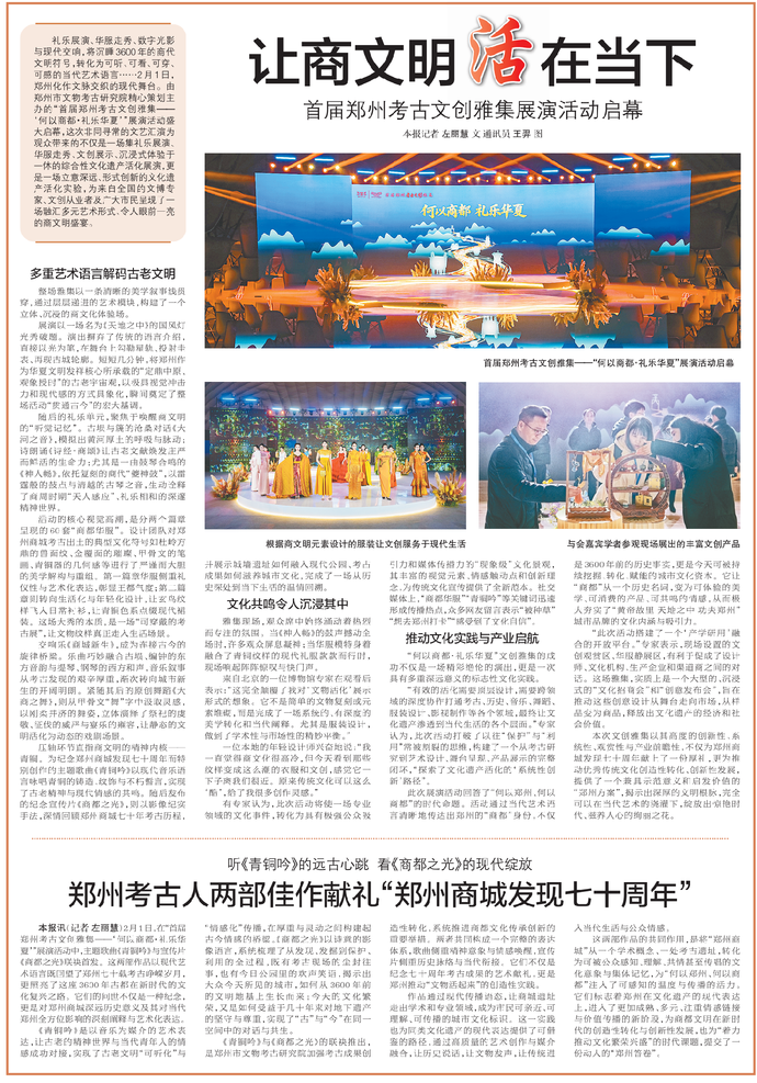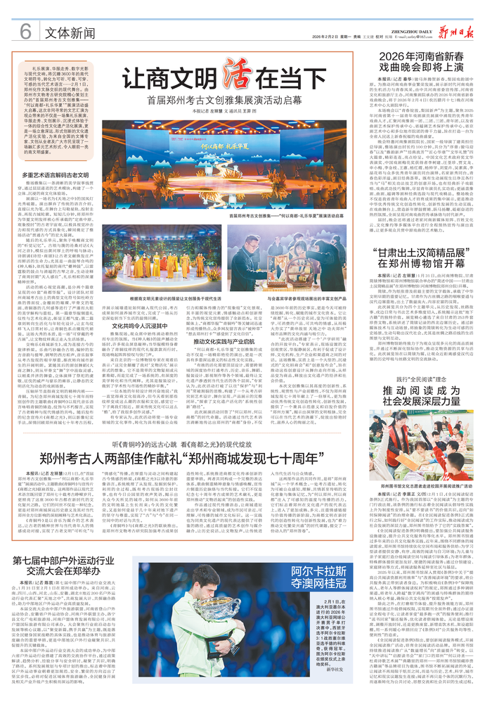 礼乐展演、华服走秀、数字光影与现代交响,将沉睡3600年的商代文明符号,转化为可听、可看、可穿、可感的当代艺术语言……2月1日,郑州化作文脉交织的现代舞台。由郑州市文物考古研究院精心策划主办的“首届郑州考古文创雅集——‘何以商都·礼乐华夏’”展演活动盛大启幕,这次非同寻常的文艺汇演为观众带来的不仅是一场集礼乐展演、华服走秀、文创展示、沉浸式体验于一体的综合性文化遗产活化展演,更是一场立意深远、形式创新的文化遗产活化实验,为来自全国的文博专家、文创从业者及广大市民呈现了一场融汇多元艺术形式、令人眼前一亮的商文明盛宴。(今日《郑州日报》6版)