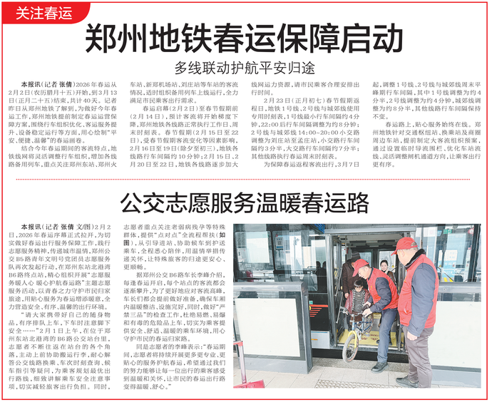 2026年春运从2月2日(农历腊月十五)开始,到3月13日(正月二十五)结束,共计40天。记者昨日从郑州地铁了解到,为做好今年春运工作,郑州地铁提前制定春运运营保障方案,围绕行车组织优化、客运服务提升、设备稳定运行等方面,用心绘制“平安、便捷、温馨”的春运画卷。(今日《郑州日报》3版)