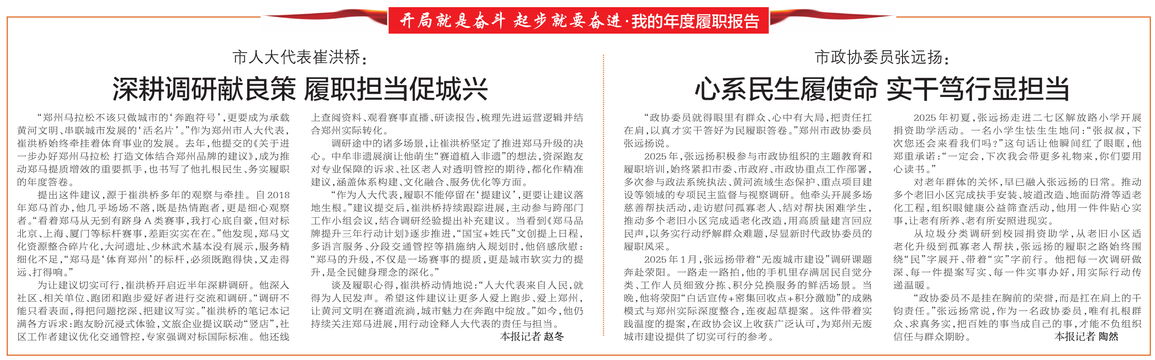 “郑州马拉松不该只做城市的‘奔跑符号’,更要成为承载黄河文明、串联城市发展的‘活名片’。”作为郑州市人大代表,崔洪桥始终牵挂着体育事业的发展。去年,他提交的《关于进一步办好郑州马拉松 打造文体结合郑州品牌的建议》,成为推动郑马提质增效的重要抓手,也书写了他扎根民生、务实履职的年度答卷。(今日《郑州日报》3版)