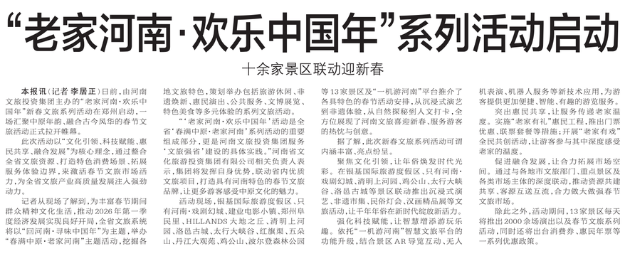 日前,由河南文旅投资集团主办的“老家河南·欢乐中国年”新春文旅系列活动在郑州启动,一场汇聚中原年韵、融合古今风华的春节文旅活动正式拉开帷幕。(今日《郑州日报》5版)