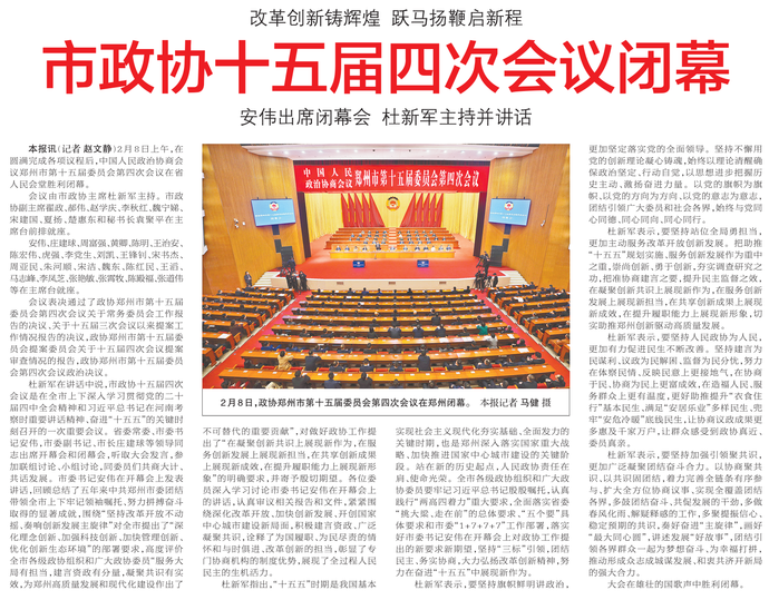 2月8日上午,在圆满完成各项议程后,中国人民政治协商会议郑州市第十五届委员会第四次会议在省人民会堂胜利闭幕。