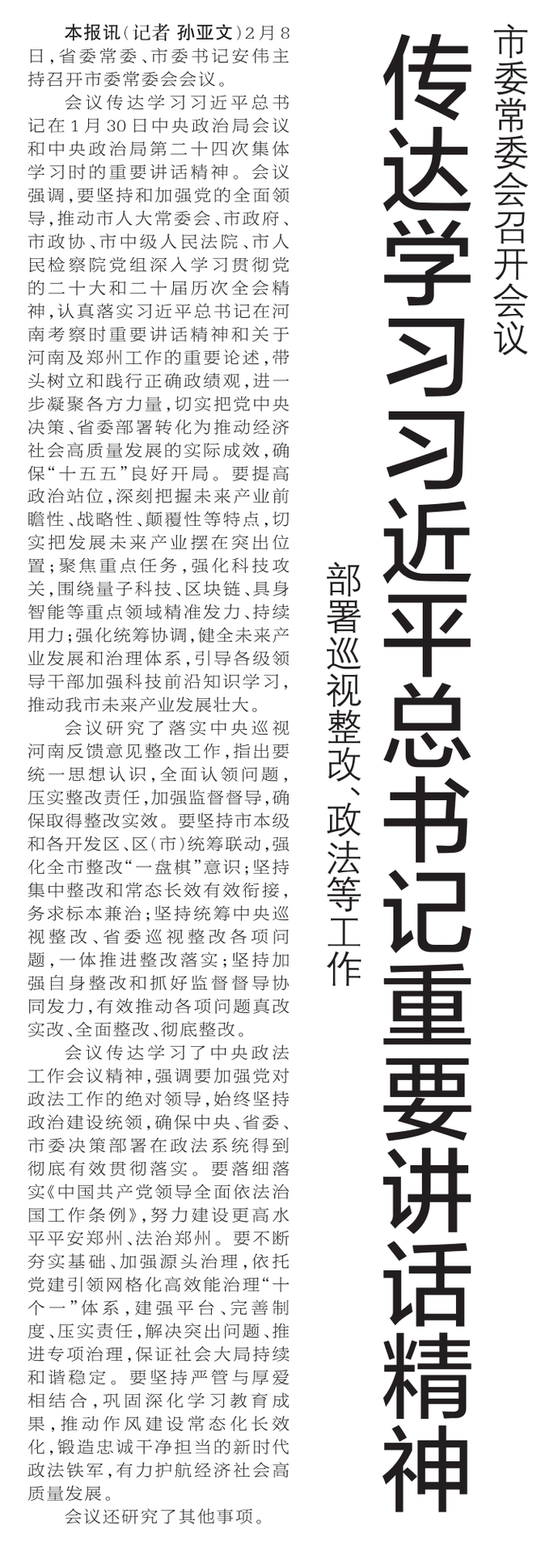 会议传达学习习近平总书记在1月30日中央政治局会议和中央政治局第二十四次集体学习时的重要讲话精神。会议强调,要坚持和加强党的全面领导,推动市人大常委会、市政府、市政协、市中级人民法院、市人民检察院党组深入学习贯彻党的二十大和二十届历次全会精神,认真落实习近平总书记在河南考察时重要讲话精神和关于河南及郑州工作的重要论述,带头树立和践行正确政绩观,进一步凝聚各方力量,切实把党中央决策、省委部署转化为推动经济社会高质量发展的实际成效,确保“十五五”良好开局。要提高政治站位,深刻把握未来产业前瞻性、战略性、颠覆性等特点,切实把发展未来产业摆在突出位置;聚焦重点任务,强化科技攻关,围绕量子科技、区块链、具身智能等重点领域精准发力、持续用力;强化统筹协调,健全未来产业发展和治理体系,引导各级领导干部加强科技前沿知识学习,推动我市未来产业发展壮大。(今日《郑州日报》1版)