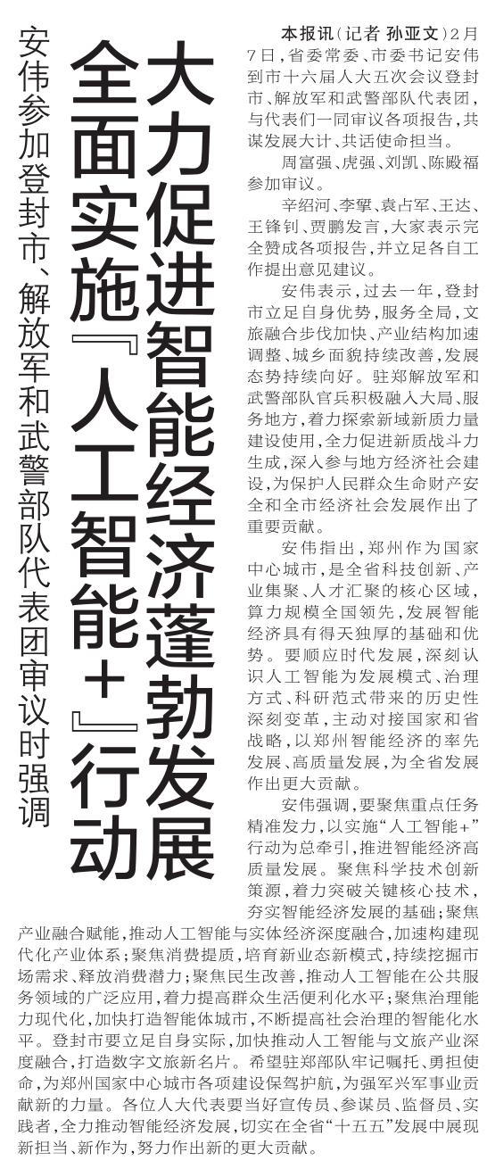 2月7日,省委常委、市委书记安伟到市十六届人大五次会议登封市、解放军和武警部队代表团,与代表们一同审议各项报告,共谋发展大计、共话使命担当。(今日《郑州日报》1版)