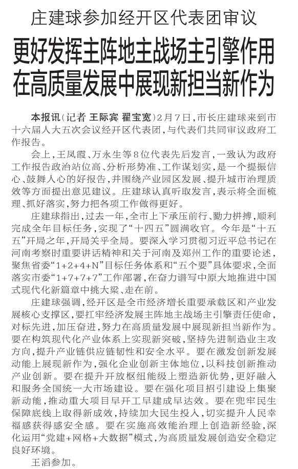 会上,王凤霞、万永生等8位代表先后发言,一致认为政府工作报告政治站位高、分析形势准、工作谋划实,是一个提振信心、鼓舞人心的好报告,并围绕产业园区发展、提升城市治理质效等方面提出意见建议。庄建球认真听取发言,表示将全面梳理、抓好落实,努力把各项工作做得更好。(今日《郑州日报》1版)