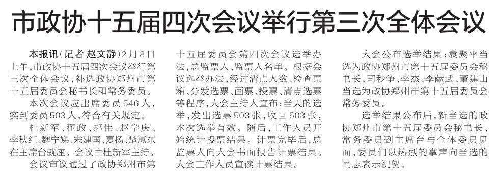 2月8日上午,市政协十五届四次会议举行第三次全体会议,补选政协郑州市第十五届委员会秘书长和常务委员。(今日《郑州日报》1版)