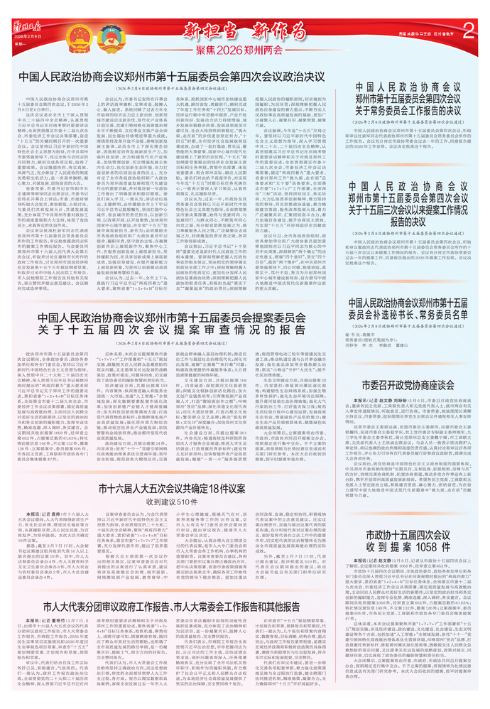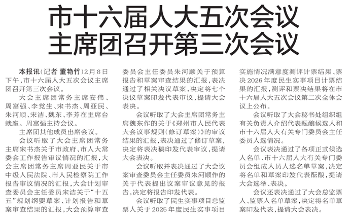2月8日下午,市十六届人大五次会议主席团召开第三次会议。(今日《郑州日报》1版)