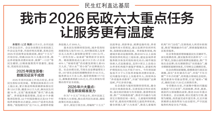 2月8日,全市民政工作会议召开。会议全面落实全省民政工作会议及市委、市政府相关部署,系统总结2025年民政事业发展成效,锚定“十五五”开局目标,明确2026年六大重点任务,推出养老服务消费补贴券、殡葬“一口价”等民生硬招,以精准施策筑牢普惠性、基础性、兜底性民生防线。(今日《郑州日报》8版)
