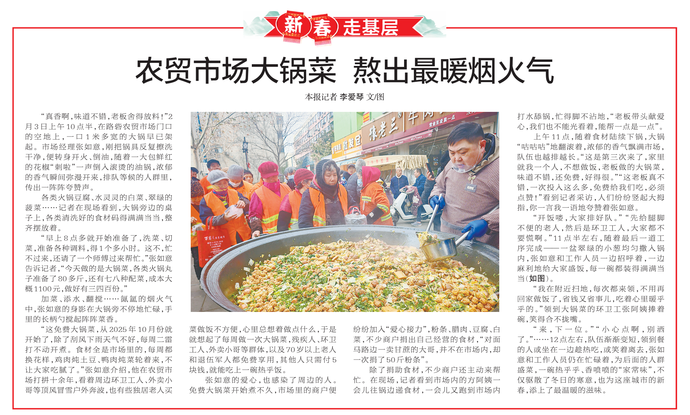 “真香啊,味道不错,老板舍得放料!”2月3日上午10点半,在路砦农贸市场门口的空地上,一口1米多宽的大锅早已架起。市场经理张如意,刚把锅具反复擦洗干净,便转身开火、倒油,随着一大包鲜红的花椒“刺啦”一声倒入滚烫的油锅,浓郁的香气瞬间弥漫开来,排队等候的人群里,传出一阵阵夸赞声。(今日《郑州日报》8版)