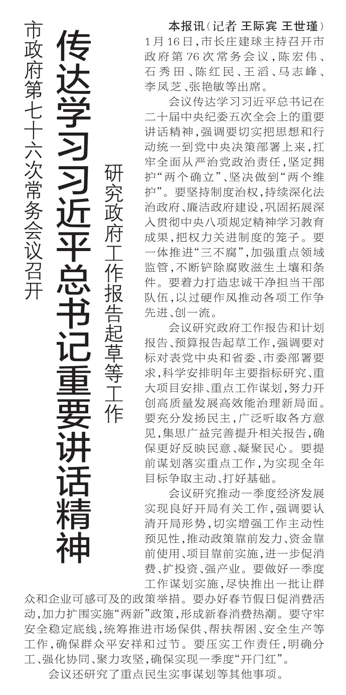 1月16日,市长庄建球主持召开市政府第76次常务会议,陈宏伟、石秀田、陈红民、王滔、马志峰、李凤芝、张艳敏等出席。