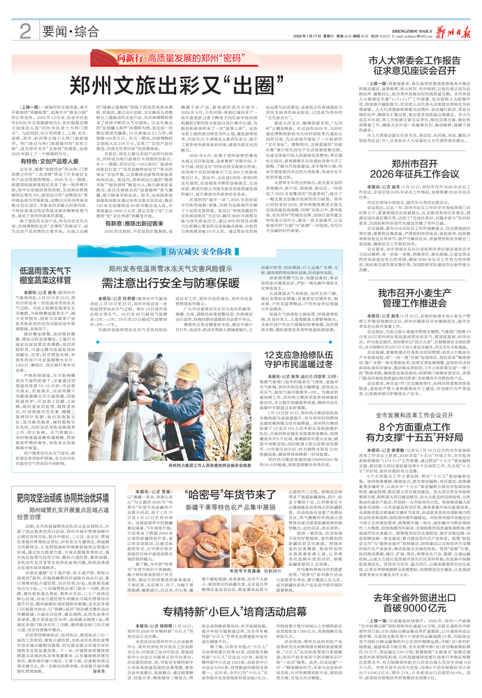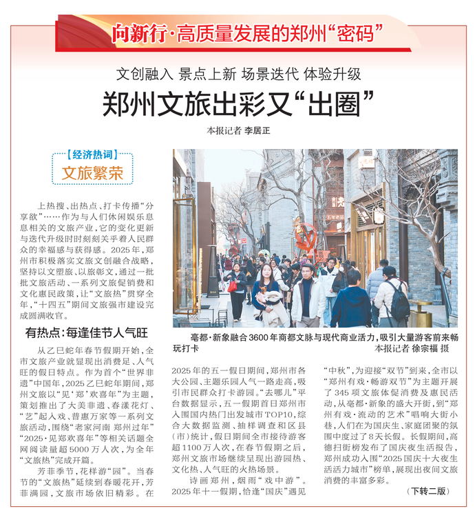 上热搜、出热点、打卡传播“分享欲”……作为与人们休闲娱乐息息相关的文旅产业,它的变化更新与迭代升级时时刻刻关乎着人民群众的幸福感与获得感。2025年,郑州市积极落实文旅文创融合战略,坚持以文塑旅、以旅彰文,通过一批批文旅活动、一系列文旅促销费和文化惠民政策,让“文旅热”贯穿全年,“十四五”期间文旅强市建设完成圆满收官。(今日《郑州日报》1版、2版)