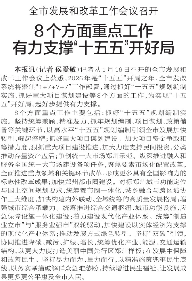 记者从1月16日召开的全市发展和改革工作会议上获悉,2026年是“十五五”开局之年,全市发改系统将聚焦“1+7+7+7”工作部署,通过抓好“十五五”规划编制实施、抓好重大项目谋划建设等8个方面的工作,为实现“十五五”开好局、起好步提供有力支撑。(今日《郑州日报》2版)