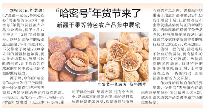 以“豫疆一家亲、各族心连心”为主题的2026年“哈密号”年货节及新疆农产品推介活动,将于1月17日至2月13日在郑州举办。这场延续多年的援疆惠民盛宴,今年再度升级,不仅带来了跨越2000余公里的新疆特色年货,更以多会场联动、沉浸式体验的形式,让中原百姓在浓浓的年味中感受丝路名城的独特魅力。(今日《郑州日报》2版)