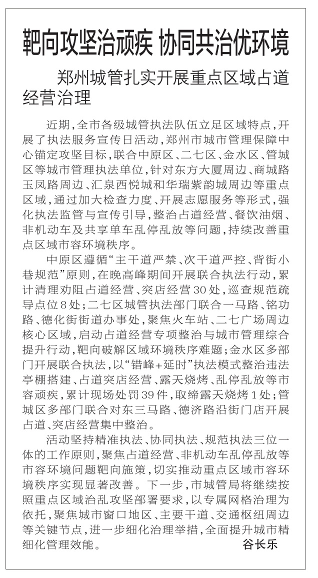近期,全市各级城管执法队伍立足区域特点,开展了执法服务宣传日活动,郑州市城市管理保障中心锚定攻坚目标,联合中原区、二七区、金水区、管城区等城市管理执法单位,针对东方大厦周边、商城路玉凤路周边、汇泉西悦城和华瑞紫韵城周边等重点区域,通过加大检查力度、开展志愿服务等形式,强化执法监管与宣传引导,整治占道经营、餐饮油烟、非机动车及共享单车乱停乱放等问题,持续改善重点区域市容环境秩序。(今日《郑州日报》2版)